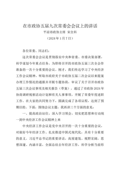 / 领导讲话:20240107在市政协五届九次常委会会议上的讲话——平凉市政协主席