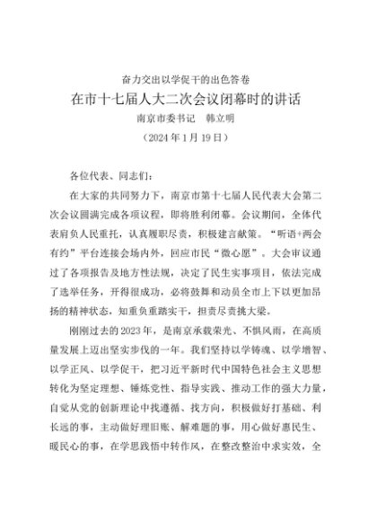 / 领导讲话:20240119在市十七届人大二次会议闭幕时的讲话——南京市委书记