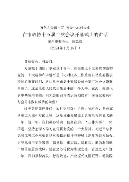 / 领导讲话:20240115在市政协十五届三次会议开幕式上的讲话——常州市委书记