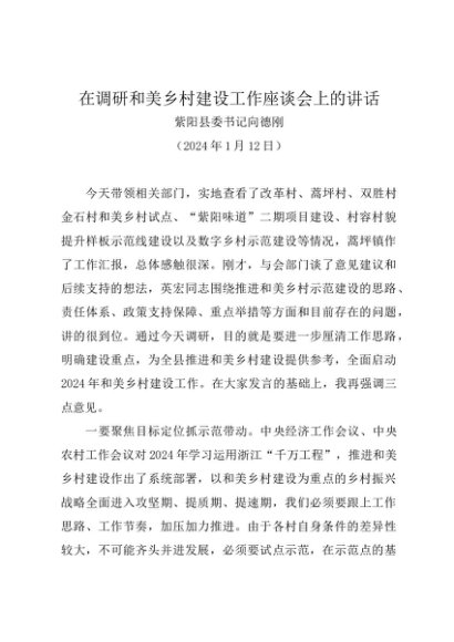 / 领导讲话:20240112在调研和美乡村建设工作座谈会上的讲话——紫阳县委书记向德刚
