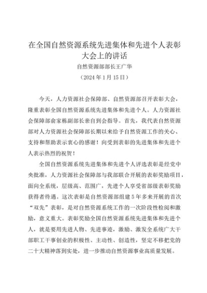 领导讲话:20240115(总结部署自然资源年度工作)在全国自然资源系统先进集体和先进个人表彰大会上的讲话——自然资源部部长王广华