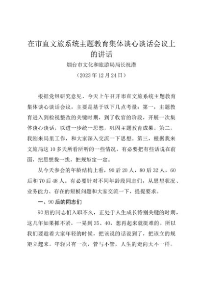 / 领导讲话:20231224在市直文旅系统主题教育集体谈心谈话会议上的讲话——烟台市文化和旅游局局长祝潜