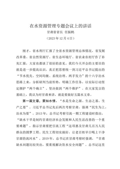 / 领导讲话:20231204在全省水资源管理专题会议上的讲话——甘肃省省长 任振鹤