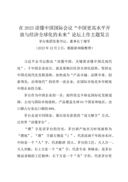 领导讲话:20231202在2023读懂中国国际会议“中国更高水平开放与经济全球化的未来”论坛上作主题发言——茅台集团党委书记、董事长丁雄军