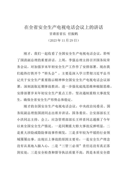 / 领导讲话:20231129(安全生产工作会议)在全省安全生产电视电话会议上的讲话——甘肃省省长 任振鹤