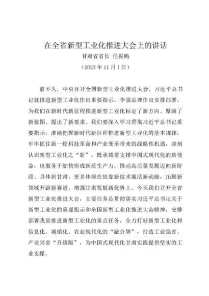 / 领导讲话:20231101(新型工业化推进大会)在全省新型工业化推进大会上的讲话——甘肃省省长 任振鹤