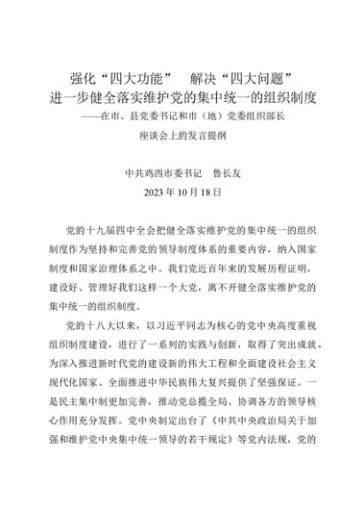 / 领导讲话:20231018健全落实维护党的集中统一的组织制度(在组织部长座谈会上的发言)——鸡西市委书记