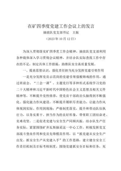 领导讲话:20231012抽放队党支部书记:在矿四季度党建工作会议上的发言