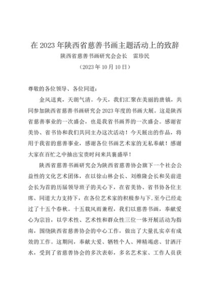 / 领导讲话:20231010陕西省慈善书画研究会会长雷珍民:在2023年陕西省慈善书画主题活动上的致辞