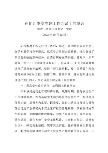 / 领导讲话:20231012掘进三队党支部书记:在矿四季度党建工作会议上的发言