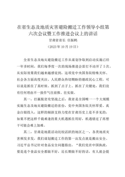 / 领导讲话:20231019在省生态及地质灾害避险搬迁工作领导小组第六次会议暨工作推进会议上的讲话——甘肃省省长 任振鹤