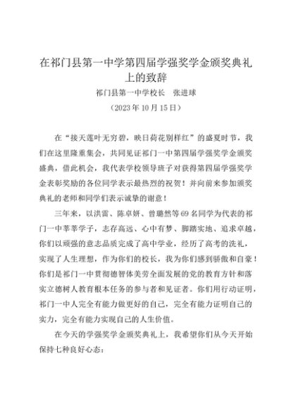 领导讲话:20231015祁门县第一中学校长张进球:在学强奖学金颁奖典礼上的致辞