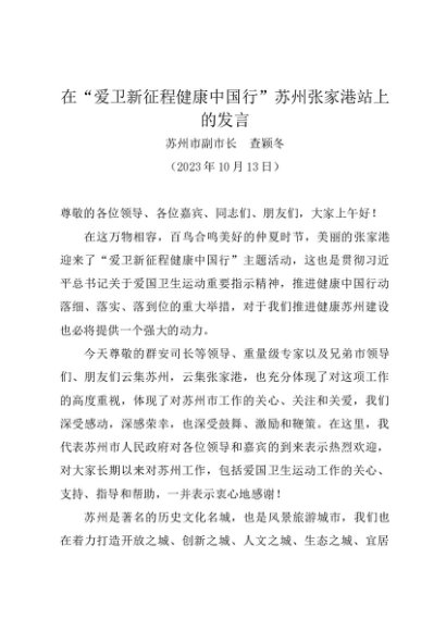 / 领导讲话:20231013苏州市副市长:在“爱卫新征程健康中国行”(爱国卫生运动)苏州张家港站上的发言