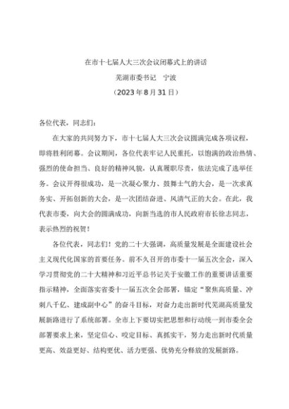 / 领导讲话:20231018在市十七届人大三次会议闭幕式上的讲话——芜湖市委书记 宁波