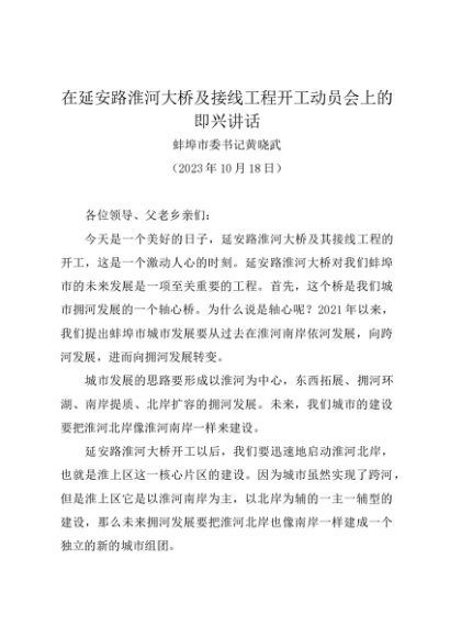 / 领导讲话:20231018在延安路淮河大桥及接线工程开工动员会上的即兴讲话——蚌埠市委书记黄晓武