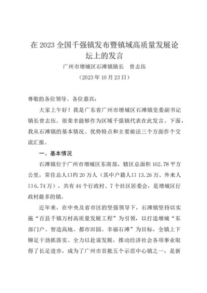 / 领导讲话:20231023广州增城区石滩镇镇长:在2023全国千强镇发布暨镇域高质量发展论坛上的发言