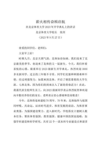 / 领导讲话:20230927在北京体育大学2023年开学典礼上的讲话——校长 张剑