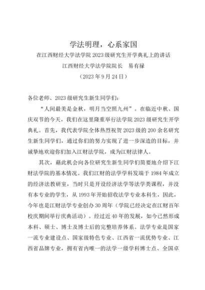/ 领导讲话:20230924江西财经大学法学院院长易有禄:在2023级研究生开学典礼上的讲话