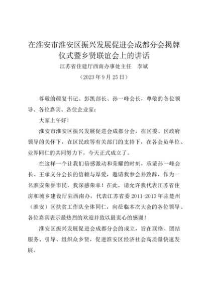 / 领导讲话:20230925在振兴发展促进会成都分会揭牌仪式暨乡贤联谊会上的讲话——住建厅西南办事处主任 李斌