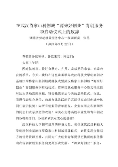 / 领导讲话:20230926在武汉岱家山科创城“源来好创业”青创服务季启动仪式上的致辞
