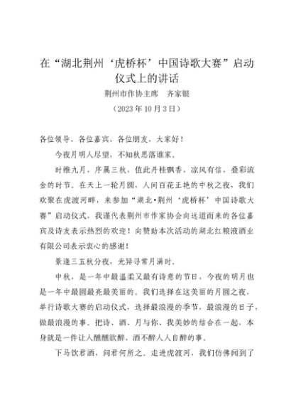 / 领导讲话:20231003荆州市作协主席齐家银:在“湖北荆州‘虎桥杯’中国诗歌大赛”启动仪式上的讲话