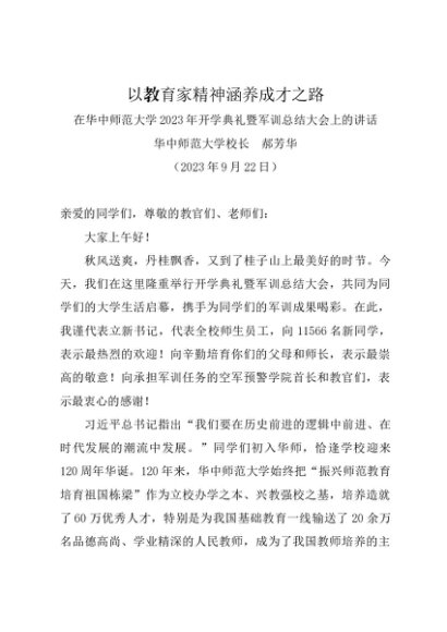 / 领导讲话:20230922华中师范大学校长郝芳华:在华中师范大学2023年开学典礼暨军训总结大会上的讲话