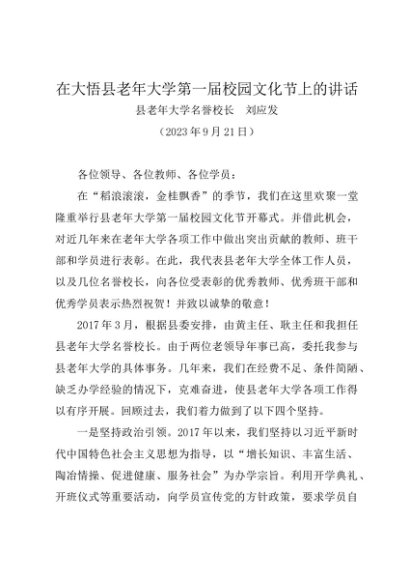 / 领导讲话:20230921在大悟县老年大学第一届校园文化节上的讲话——校长 刘应发