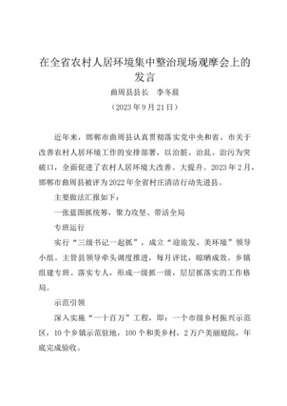 / 领导讲话:20230921在全省农村人居环境集中整治现场观摩会上的发言——曲周县县长 李冬晨
