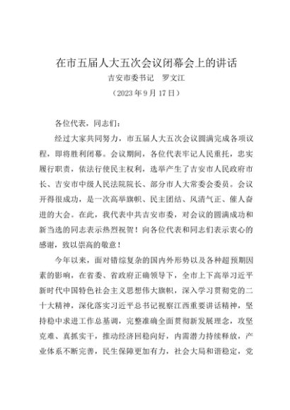 领导讲话:20230917在市五届人大五次会议闭幕会上的讲话——吉安市委书记 罗文江