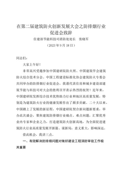 / 领导讲话:20230918住建部节能科技司消防处:在第二届建筑防火创新发展大会之防排烟行业促进会致辞