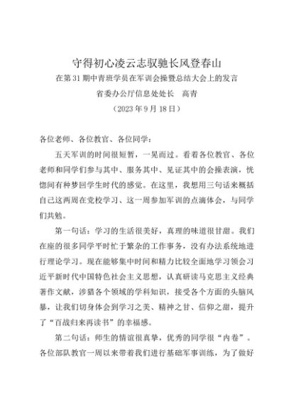 / 领导讲话:20230918省委办公厅信息处处长:在第31期中青班学员在军训会操暨总结大会上的发言