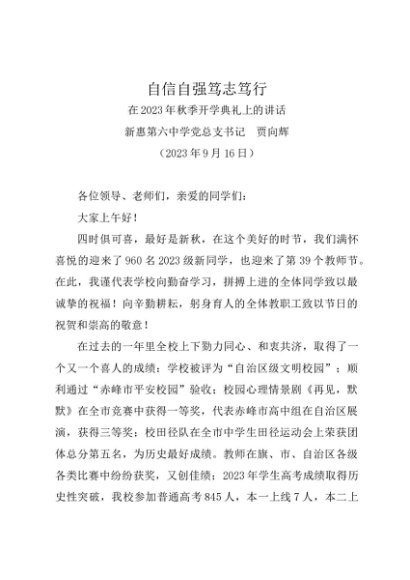 / 领导讲话:20230916在2023年秋季开学典礼上的讲话——新惠第六中学党总支书记 贾向辉