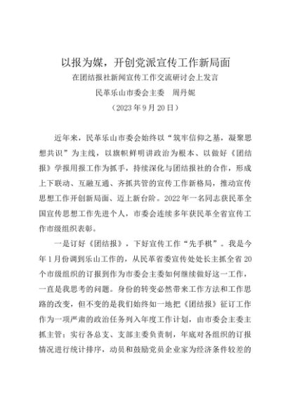 / 领导讲话:20230920在团结报社新闻宣传工作交流研讨会上发言——民革乐山市委会主委 周丹妮