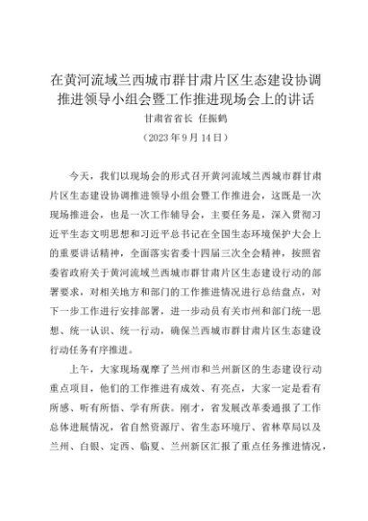 领导讲话:20230914在黄河流域兰西城市群甘肃片区生态建设协调推进领导小组会暨工作推进现场会上的讲话——甘肃省省长 任振鹤