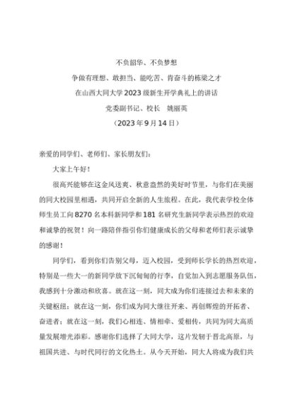 / 领导讲话:20230914在山西大同大学2023级新生开学典礼上的讲话——校长 姚丽英