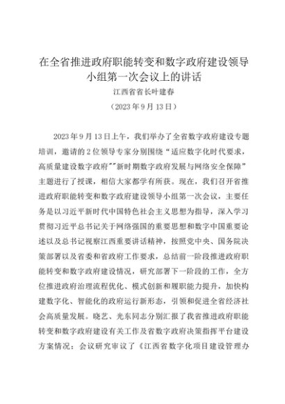 领导讲话:20230913(数字政府建设)在全省推进政府职能转变和数字政府建设领导小组第一次会议上的讲话——江西省省长叶建春