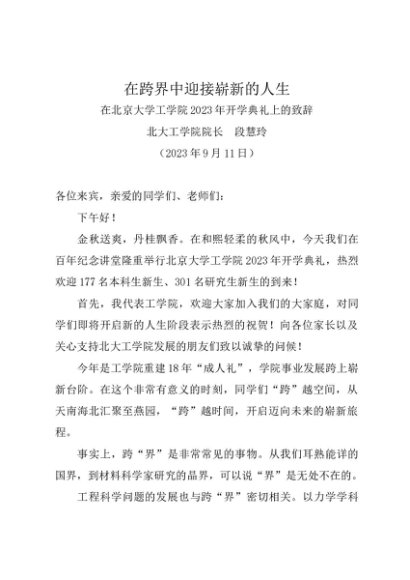 / 领导讲话:20230911在北京大学工学院2023年开学典礼上的致辞——北大工学院院长 段慧玲