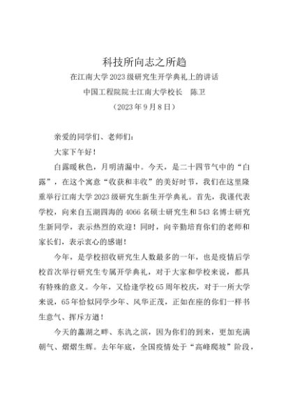 领导讲话:20230908在江南大学2023级研究生开学典礼上的讲话——校长 陈卫