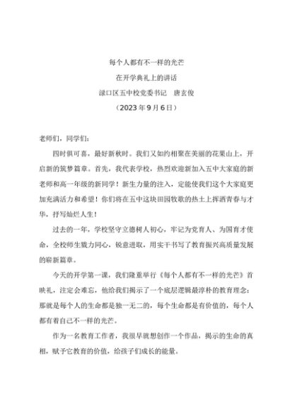 / 领导讲话:20230906在开学典礼上的讲话——渌口区五中校党委书记 唐玄俊