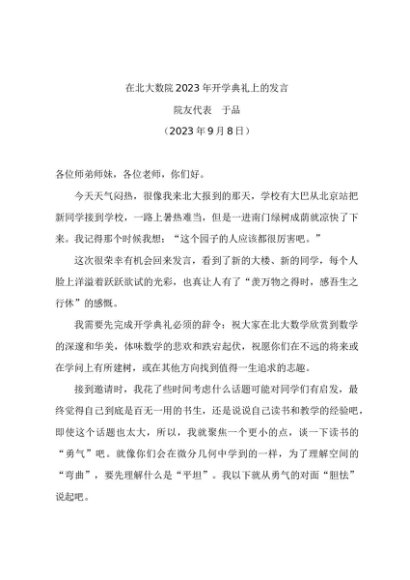/ 领导讲话:20230908在北大数院2023年开学典礼上的发言——院友代表 于品