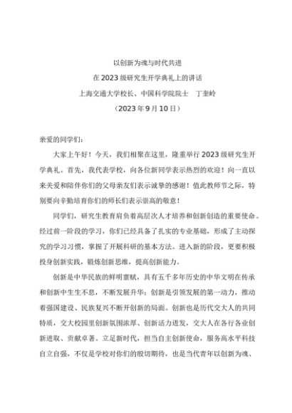 / 领导讲话:20230910在2023级研究生开学典礼上的讲话——上海交通大学校长丁奎岭