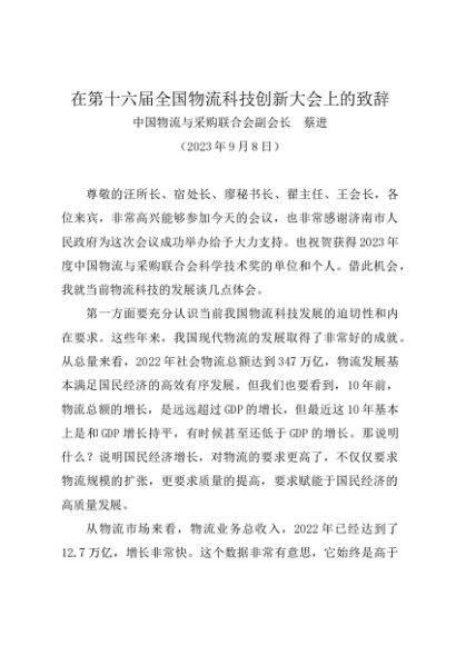 / 领导讲话:20230908在第十六届全国物流科技创新大会上的致辞——中国物流与采购联合会副会长 蔡进