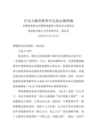 / 领导讲话:20230910南京航空航天大学党委书记:在教师荣休仪式暨新进教师入职仪式上的讲话