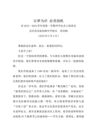/ 领导讲话:20230904在2023—2024学年度第一学期开学仪式上的讲话——宝应县初级中学校长 苗培鹤