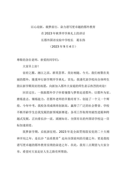 / 领导讲话:20230904在2023年秋季开学典礼上的讲话——长郡外国语实验中学校长 葛东伟