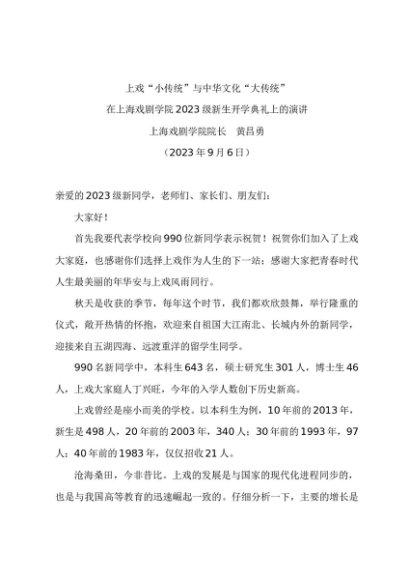 / 领导讲话:20230906在上海戏剧学院2023级新生开学典礼上的演讲——院长 黄昌勇