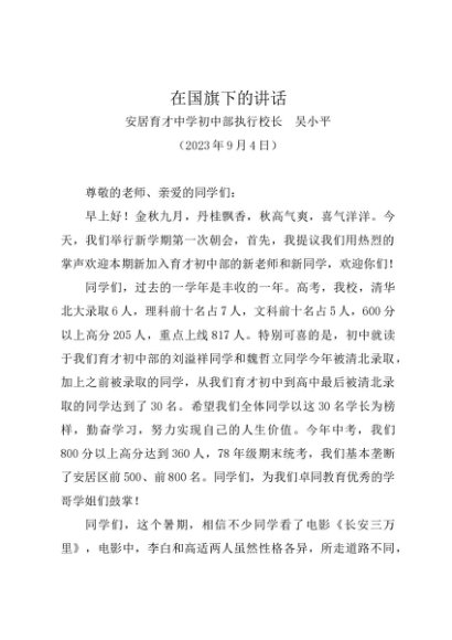 / 领导讲话:20230904在国旗下的开学典礼讲话——安居育才中学初中部执行校长 吴小平
