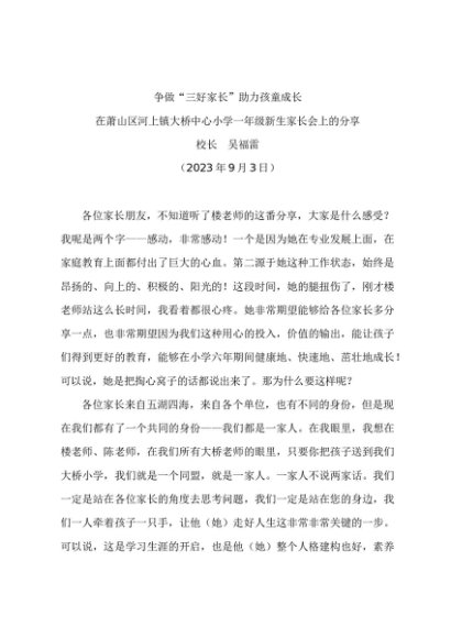 / 领导讲话:20230903在萧山区河上镇大桥中心小学一年级新生家长会上的分享——校长 吴福雷