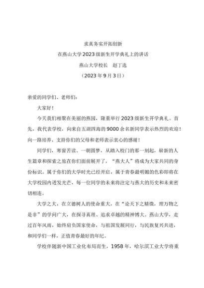 / 领导讲话:20230903在燕山大学2023级新生开学典礼上的讲话——校长 赵丁选