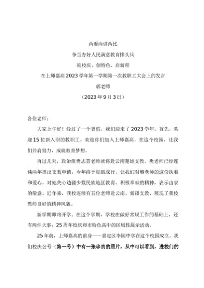 领导讲话:20230903在上师嘉高2023学年第一学期第一次教职工大会上的发言——郭老师